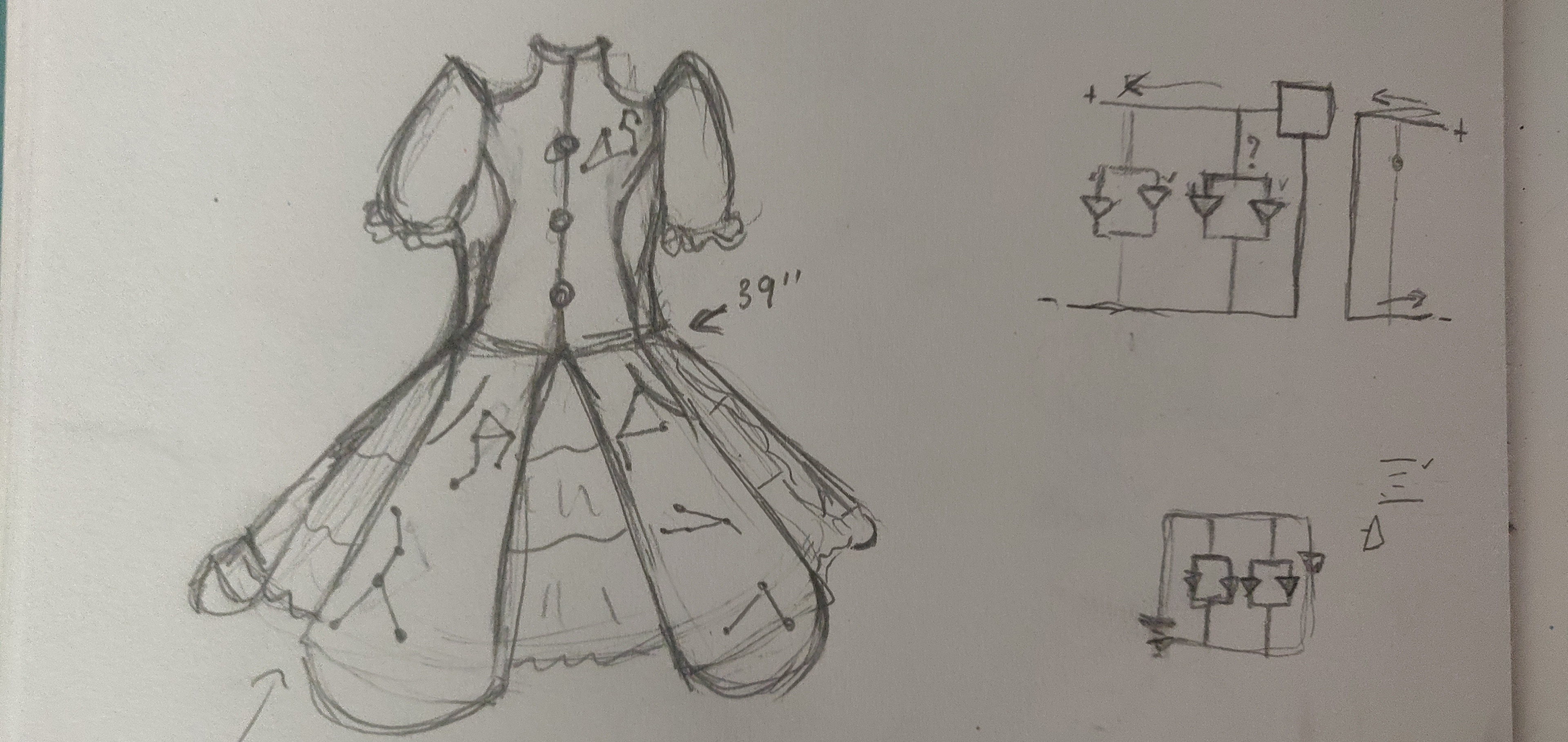 The picture below is actually a part of it – and my final did end up looking quite similar. Unlike them however, I used a parallel circuit and LEDs instead of fairy lights to illuminate the skirt. The batteries would have been way too heavy otherwise!